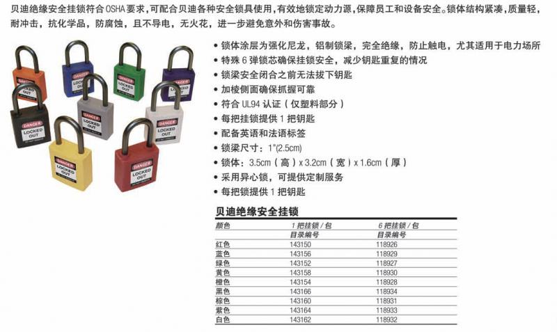 特性和優(yōu)點(diǎn):1• 外形緊湊,質(zhì)量輕      2  • 一體式“無(wú)縫”鎖體結(jié)構(gòu)經(jīng)久耐用• 玻璃纖維強(qiáng)化尼龍鎖體,防撞性能更佳  3• 三重涂層硬質(zhì)鋼鎖梁具有出色的防腐蝕性能   4• 特殊6彈鎖心確保掛鎖安全,進(jìn)一步減少鑰匙重復(fù)的情況   5• 安全功能可避免在鎖梁安全閉合之前拔下鑰匙。  6• 即使佩戴手套,加棱側(cè)面仍可確保抓握可靠   7• 可提供8種醒目顏色    8• 單獨(dú)出                                 售,提供6個(gè)裝套裝     9• 每把掛鎖提供1把鑰匙